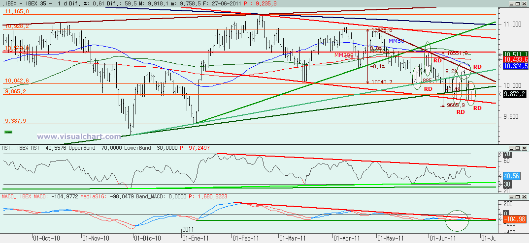 Lunes 27 de Junio de 2011: Jornada, por fin, con un pequeño rebote en el Ibex que nos ha dado un respiro a las caídas de días previos. Anoche señalábamos varios posibles escenarios de corto plazo y señalamos que hoy deberíamos intentar averiguar cuál era el correcto. Sin embargo, lamentablemente todos siguen siendo posibles y deberemos esperar a mañana a ver si podemos descartar alguno y dar con el escenario correcto. Mientras tanto, veamos lo que nos dicen los gráficos.