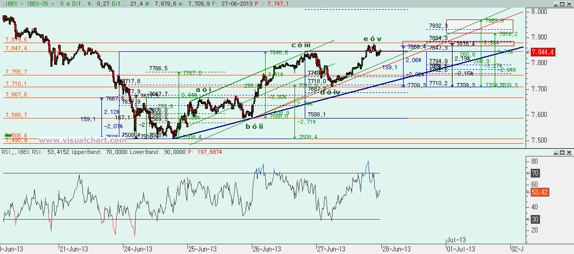 Pero claro, lo mejor es ver este rebote y su forma para darnos cuenta de si vamos a seguir subiendo o no. Y el caso es que anoche dijimos que podríamos haber acabado una c ó iii y que había que vigilar si caíamos a la zona del 7.718-7.748 para desde ahí rebotar y completar 5 alcistas o si todo había sido un ABC. Y hoy hemos caído unos pocos puntos más pero sin llegar al máximo de la i para llegar a la parte baja del tridente alcista y rebotar desde ahí para quedarnos dentro del primer objetivo alcista para una v que estaba entre el 7.869-7.884. Si hubiéramos terminado la v deberemos romper la ii-iv en menos tiempo del que tardó la v en formarse, con lo que la alcista roja es la que debemos vigilar. Pero si no rompemos aún, entonces habrá que vigilar el segundo objetivo alcista para la v que está entre el 7.918-7.969 para luego deber caer y perder esa ii-iv. Y si son 5 alcistas, entonces esto debería ser solo una primera parte del rebote, para luego hacer una corrección a esas 5 alcistas y subir de nuevo. Y entonces evaluar qué es este rebote. Si una rebote a una ABc completa bajista o si es la 4 de 5 bajistas como hemos puesto abajo. Existiría otra opción que es que este canal alcista que se está haciendo fuera una bandera en ABCDE para seguir bajando, con lo que sería seguramente una 4. Pero encajan tan bien las piezas para que sean 5 alcistas que esta opción la vamos a dejar en cuarentena y solo la tendremos en cuenta si se rompe por abajo el canal y luego caemos muy deprisa perdiendo el mínimo de la semana.