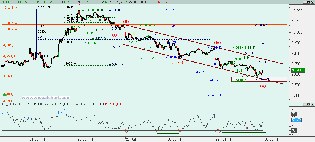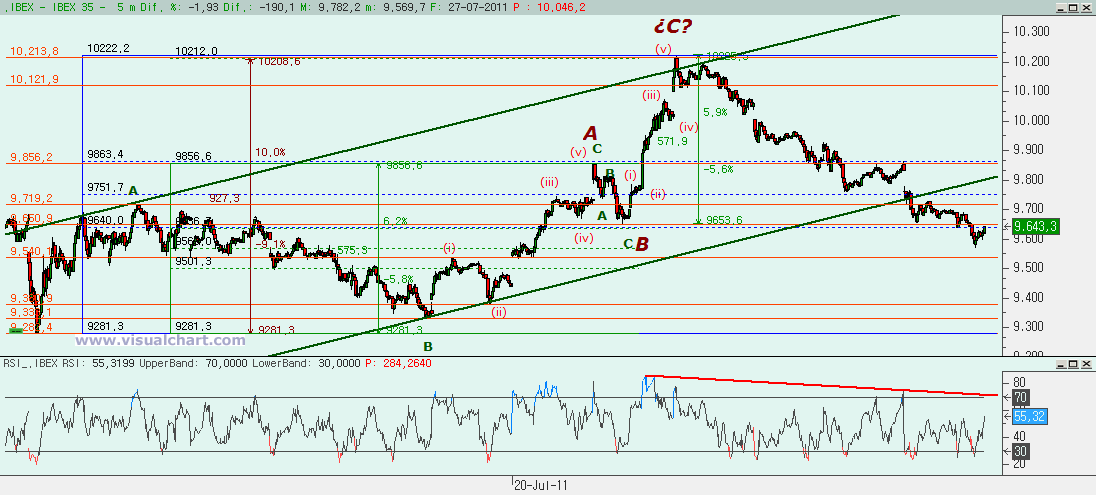 Si hacemos ese zoom, entonces vemos diferentes posibilidades. La primera es que estemos haciendo cinco bajistas desde máximos del Viernes. Podríamos haber hecho la (i), la (ii), la (iii) igual al 162% de la (i), la (iv) y ahora la (v). El primer objetivo para la (v) estaría en la zona del 9.535-9.579. En ese rango tenemos la cota que haría la (v) igual al 162% de la (i), la que haría la (v) igual al 61,8% del conjunto (i)-(iii), la que haría la (v) igual a la (iii) y la que haría el conjunto (iii)-(v) igual al 262% de la (i). Si se perdiera esa cota, entonces podría ser que tuviéramos que ir a los 9.400 para hacer la (v) igual al conjunto (i)-(iii). El RSI parece avalar este recuento, con divergencias alcistas desde la iii de la (iii).