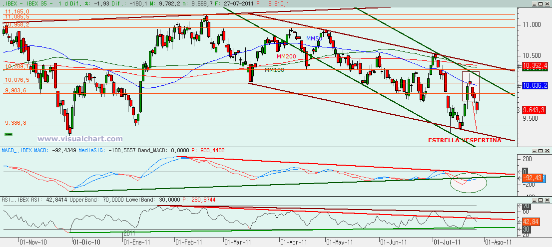 Miércoles 27 de Julio de 2011: Tras la estrella vespertina en el gráfico diario del Ibex que se formó el Lunes hemos vuelto a caer en la jornada de hoy. La caída ya ha alcanzado (e incluso rebasado) el 61,8% de la subida desde mínimos de hace dos semanas. La pregunta ahora es hasta dónde va a llegar esta caída. Para ello, nada mejor que ver lo que nos dicen los gráficos.