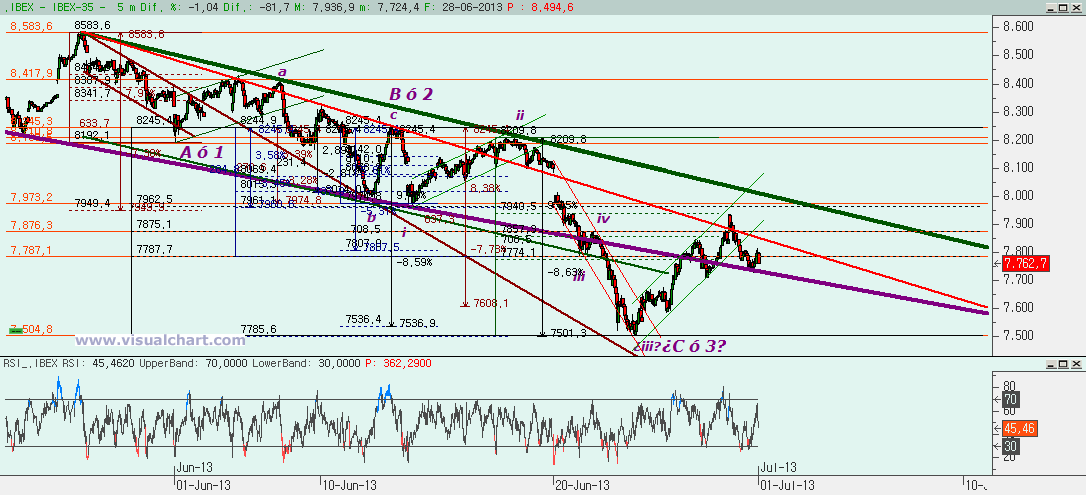 Gráfico desde finales de mayo: teníamos la duda de si en el mínimo de la semana terminamos una iii o bien una C completa de un ABC o bien 3 de 5 bajistas. El rebote ha ido ya bastante arriba, pero todavía no hemos alcanzado ningún nivel para descartar o confirmar ningún escenario. Si fuera una iv, no deberíamos pasar el 7.973 bajo ningún concepto y nos hemos parado antes. Si fuera una 4 no deberíamos superar el 8.192 y estamos aún lejos… Hemos penetrado la bajista roja que podría ser una 0-B, aunque como pasa por debajo de parte de la posible C hay que andarse con ojo y entonces la referencia puede ser la bajista verde, que aún está lejos… Por ello, mientras no rompamos alguno de estos niveles no podemos descartar que aún quede más por abajo. Nos damos cuenta de que el rebote acabó el viernes rompiendo el canal alcista y ahora se trata de ver si esto ha sido una a de una iv ó 4 ó una a ó 1 correctiva al ABC acabado.