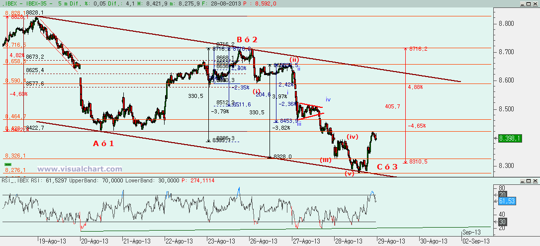 Gráfico desde máximos de hace dos semanas: vemos que el canal bajista se ha respetado casi a la perfección y podríamos haber hecho un ABC, con la C ligeramente más larga que la A (apenas 35 puntos). El recuento de la C parece completo en 5 ondas, con la (iii) igual al 262% de la (i) y la (v) igual a la (i). Luego ahora hay que ver si realmente ha terminado la caída en ABC o si es un ABCDE y queda un toque nuevo a la parte alta del canal. Lo que parece claro es que no son 5 bajistas porque el rebote desde mínimos de hoy ya ha llegado al mínimo de la posible 1.
