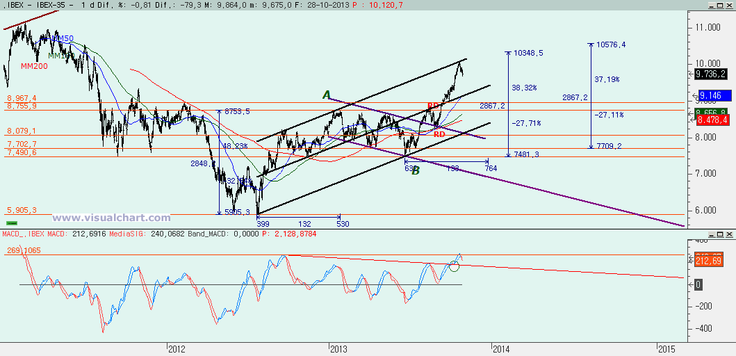 Gráfico diario: vemos que el rechazo en la parte alta del tridente alcista nos ha llevado ya a más de 400 puntos abajo y el corte del MACD a la baja nos indica que la corrección debería llevarnos varias sesiones, siendo el objetivo seguramente la parte central del tridente, y apoyo en la MM50. Y lo cierto es que era imposible seguir la subida separándonos tanto de las medias. El MACD veremos si simplemente va a hacer un throw-back a la bajista rota o si se va más abajo y la corrección nos lleva varias semanas. Aunque mientras el tridente alcista siga vigente, el objetivo final debería ser ese 10.350 (o el 10.575, dependiendo de dónde haya comenzado la C) para hacer la C igual a la A desde mínimos de 2012.