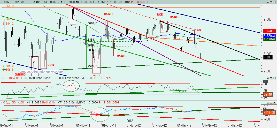 Jueves 29 de Marzo de 2012: Nueva jornada bajista en el Ibex, y van ya unas cuantas seguidas, que deja ya al Ibex en las inmediaciones de la alcista desde mínimos de septiembre y aún sin darnos ninguna señal de giro. Mientras no se rompa esa alcista y los mínimos de septiembre, técnicamente no podemos decir que estemos bajistas a medio plazo, pero debemos estar muy atentos a lo que suceda por esta zona. Veamos por qué…