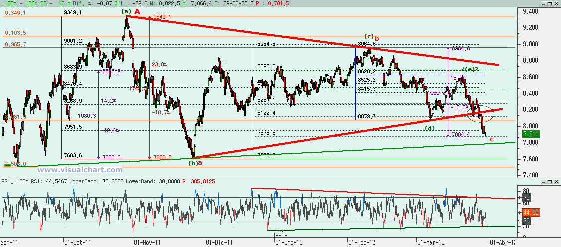 Si miramos el gráfico desde mínimos de septiembre, vemos como el triángulo roto hace un par de días está ahí con la opción de que hayamos terminado ese triángulo con un (e) y que hayamos comenzado un impulso bajista. Pero para ello hay que romper la alcista desde esos mínimos, no sea que el triángulo correcto sea otro. Pero atentos también al posible recuento rojo, no sea que lo que estemos haciendo sea una B y luego haya que hacer una C alcista. El caso es que en esa B podríamos estar haciendo la c, y el primer objetivo bajista para la c estaba justo en el 7.884 para ser igual al 61,8% de la a. Y encima coincidiendo con el 80% de la b. Y es la zona que hemos alcanzado esta mañana. Luego es zona de potencial final de la B y comienzo de la C alcista. Pero si perdemos esta zona entonces o el recuento rojo no es correcto o hay que ir a buscar el 100% de la a por lo que habría que ir 700 puntos más abajo. Y atentos también a la opción de que el triángulo correcto se haga en la alcista verde por abajo.