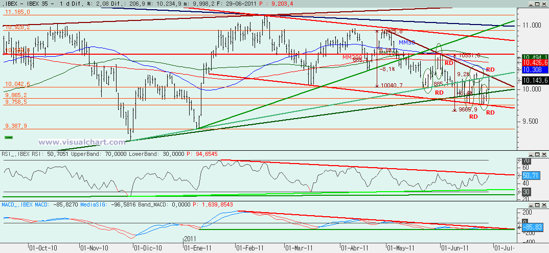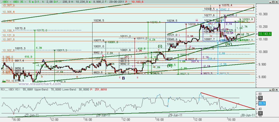 Miércoles 29 de Junio de 2011: Nueva jornada de alzas en el Ibex en el día de hoy. Desde que señalamos la señal de giro en el gráfico diario el Lunes en forma de Reversal Day hemos tenido dos jornadas con subidas y hoy de manera importante. Ayer señalamos en el análisis diario que se había formado un canal alcista pero con poca pendiente y que hoy deberíamos romperlo por arriba si queríamos seguir subiendo. Lo hemos hecho. Luego dimos un primer objetivo alcista en los 10.082, en cuya cercanía tuvimos el primer parón de la jornada. Y después marcamos el siguiente objetivo en los 10.240 si superábamos esos 10.082 y llegamos a apenas 6 puntos. Ahora de lo que se trata es de ver si esta subida ha terminado, se ha tomado un respiro para seguir subiendo o si mañana vamos a continuar la senda alcista. Veamos lo que nos dicen los gráficos.