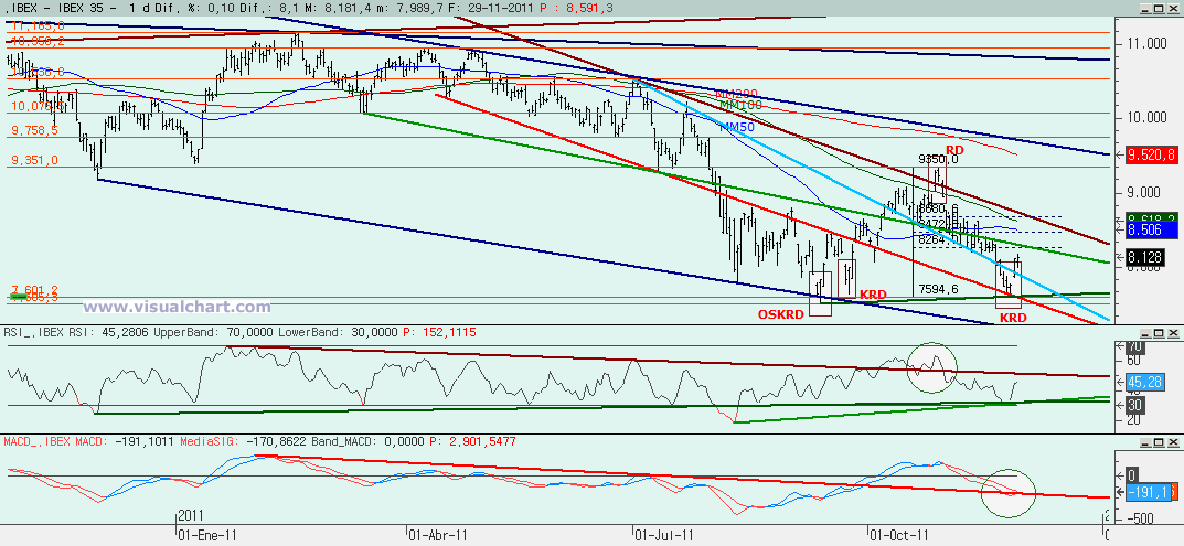 Martes 29 de Noviembre de 2011: Jornada de consolidación en el Ibex tras la subida de ayer. Hemos marcado un máximo por encima del de ayer pero sin demasiadas fuerzas para seguir subiendo y tampoco ha habido ganas de corregir la subida de ayer. Por tanto, las espadas siguen en todo lo alto y parece que el KRD del viernes sigue indicándonos que hemos comenzado un tramo alcista que debería llevarnos más arriba en las próximas sesiones aunque podamos tener una corrección a esta subida. Sin embargo, hay un pero y lo vamos a ver. Vayamos con ello.