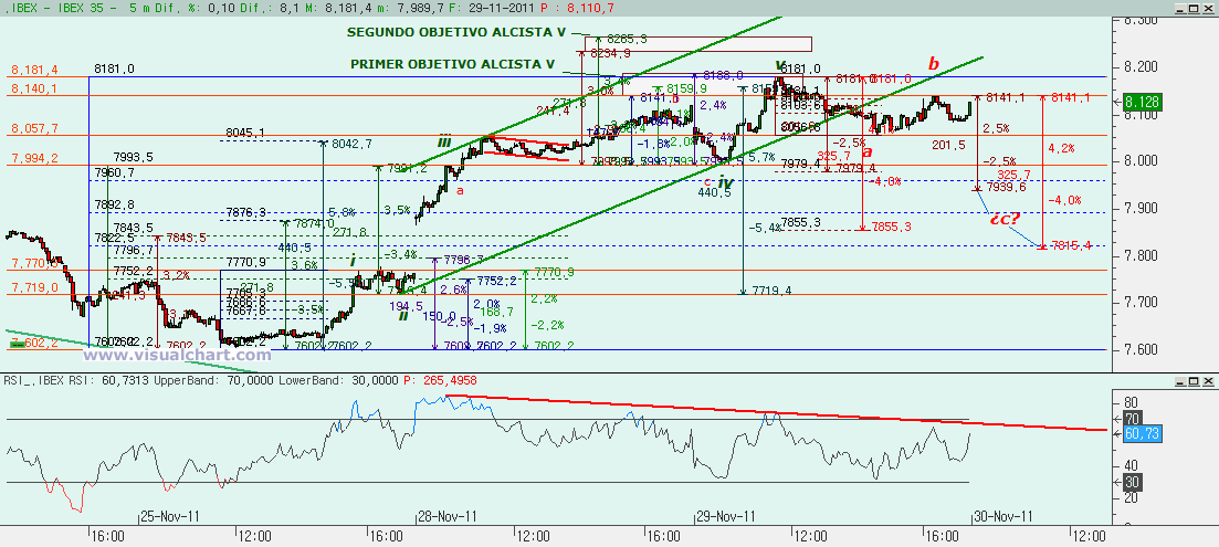Hay alguna otra opción posible, pero, de momento, vamos a quedarnos con estas dos por lo bien que encajan los niveles así como por como encajan las divergencias bajistas del RSI. El primer recuento se invalida si hacemos un nuevo máximo mañana sin irnos al objetivo bajista. El segundo recuento se invalida si vamos más abajo del 7.960. En el segundo recuento, si bajamos por debajo del 8.058 es que la iv no terminó en la bandera señalada sino que hay que esperar a que termine de otra forma.