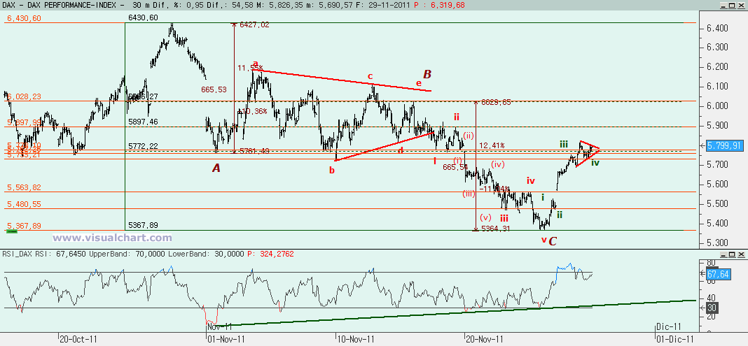 Por último, hemos dicho que el ibex aún no ha superado el 8.192 que podría significar que podría aún quedar un tramo por abajo. Tampoco hemos llegado al 38,2% de la caída. Pero al igual que en su momento nos fijamos en el gráfico del DAX para ver si podíamos identificar el recuento del Ibex y nos sirvió de mucho, si ahora miramos de nuevo el gráfico del DAX nos damos cuenta de que hemos solapado ya con el mínimo de la A y con el mínimo de la i de la C, lo que nos indica a las claras que en el mínimo del viernes hicimos una ABC y que allí terminó. Además, ya hemos llegado al 38,2% de la caída, y parece que aún nos quedaría un tramo por arriba, puesto que habríamos hecho hasta una iv (en banderín). Y tal vez el objetivo de la v estaría en el 5.900, es decir, ya en el 50% de la caída. Para que este recuento fuera bueno no se debería perder el 5.733. Si se pierde, entonces el banderín no sería una iv y habría que ver otras opciones. Y si al DAX le queda algo por arriba podría significar que el recuento bueno del Ibex es el segundo.