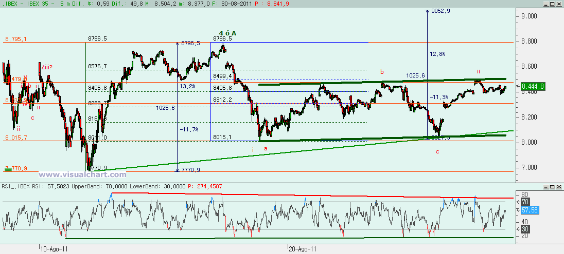 Si miramos el gráfico desde mínimos, podemos ver el canal señalado ayer y en el que hemos frenado hoy la subida. La duda está en pensar si esto es una bandera de continuación bajista o si es un canal alcista que vamos a romper para hacer un canal alcista acelerado. En la primera opción esta bandera sería una ii de la posible 5. En el segundo caso hay que pensar en que habríamos hecho una primera A, luego una B y ahora deberíamos estar haciendo la C que, si fuera igual a la A, nos debería llevar a los 9.050.