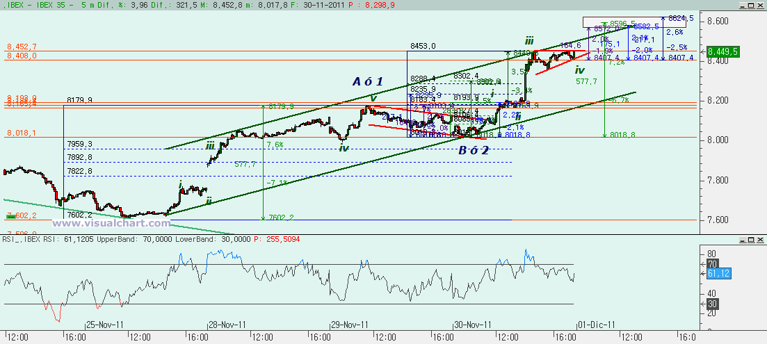 Si hacemos un zoom desde mínimos del viernes, el recuento que nos parece más fiable ahora es el de haber hecho una A ó 1 en el máximo del martes, una B ó 2 en el mínimo de hoy en forma de bandera y la subida de hoy sería la C ó 3. La idea es ver si seguimos el canal alcista que tenemos dibujado ahora o si hacemos uno acelerado. Si seguimos con este canal, podría ser que estuviéramos haciendo una ABC para luego corregir en otra ABC y luego hacer 5 alcistas en el último tramo para ir a máximos de octubre o incluso más. Si hacemos un canal alcista acelerado podría ser que estuviéramos haciendo 5 alcistas. Desde mínimos de hoy parece que hemos hecho tres alcistas con la iii igual al 162% de la i y luego una iv en triángulo ascendente. Si así fuera, tendríamos un objetivo alcista para la v entre los 8.572 y los 8.624 de modo que en este rango tendríamos la cota que haría la v igual al 38,2% del conjunto i-iii, igual a la i, igual al 50% del conjunto i-iii y la C ó 3 igual a la A ó 1. Si llegamos a esta zona entonces tendríamos la duda de si hemos hecho una ABC, si hemos terminado la 3 o si eso ha sido solo la (i) de la 3. Y el canal alcista es muy importante para descubrir cuál de las opciones es la correcta. La parte baja del canal no se puede perder mientras sigamos en una 3. Si se pierde es que no estamos en una 3 y apostaríamos por una C. Si nos giramos en esta zona, la cota a vigilar es el 8.179, máximo de la posible 1. Si se pierde, es que no estamos haciendo una 4. Si superamos la zona señalada, el segundo objetivo para la v estaría entre los 8.679-8.690.