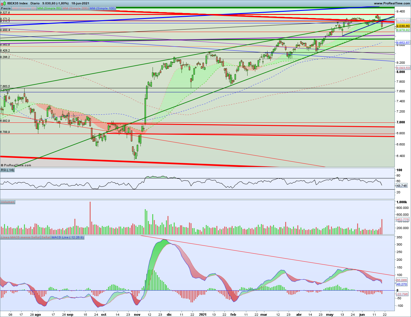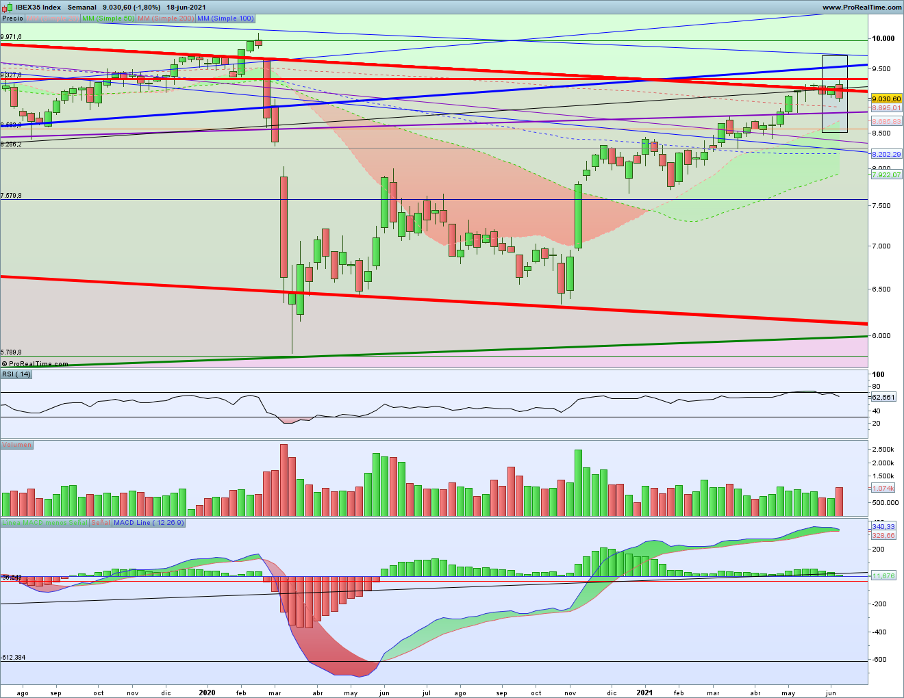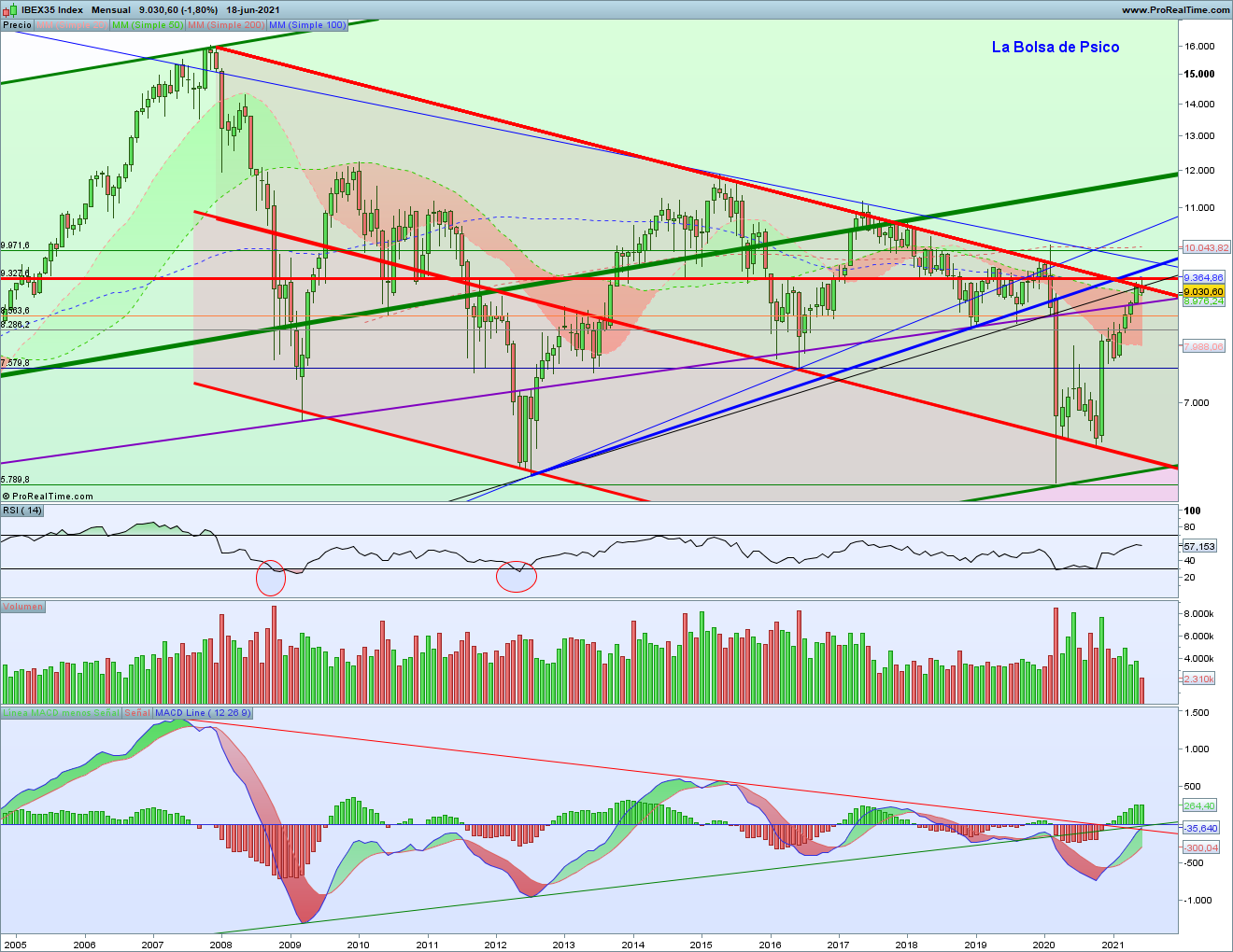Si recuerdas, hace una semana te preguntaba que si el Ibex estaba listo para romper. Y es que había vuelto a la zona de gran resistencia marcada por la parte alta del tridente bajista desde 2007, a la resistencia horizontal en la zona de los 9.300c y a la bajista del MACD desde 2007. Y en una resistencia así, no se compra, a menos que se logre romper.