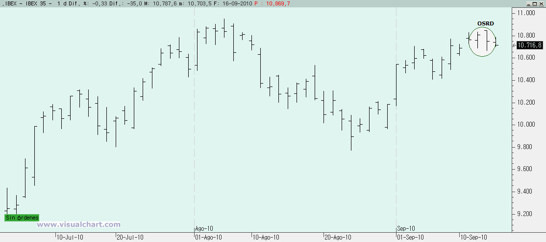 Y si hemos alcanzado el primer objetivo, entonces se trataría de encontrar una pauta de giro que nos dijera que puede comenzar un recorte. Pues bien, tal y como hemos dicho hoy a lo largo del día en los comentarios (recordamos que los que quieran seguir el desarrollo de la sesión en directo pueden acudir a nuestro blog y seguir los comentarios de este post), ayer nos quedó una pauta de giro: una Outside Reversal Day, en la que el Ibex hizo un máximo al del día previo, bajó por debajo del mínimo del día previo y cerró por debajo del cierre del día anterior, tal y como podemos ver en el gráfico. Una vez que se ha producido esta señal de giro, los que hayan abierto cortos con ella deberían poner el stop en el máximo de ayer (15 de Septiembre) más un pequeño filtro (muy pequeño).