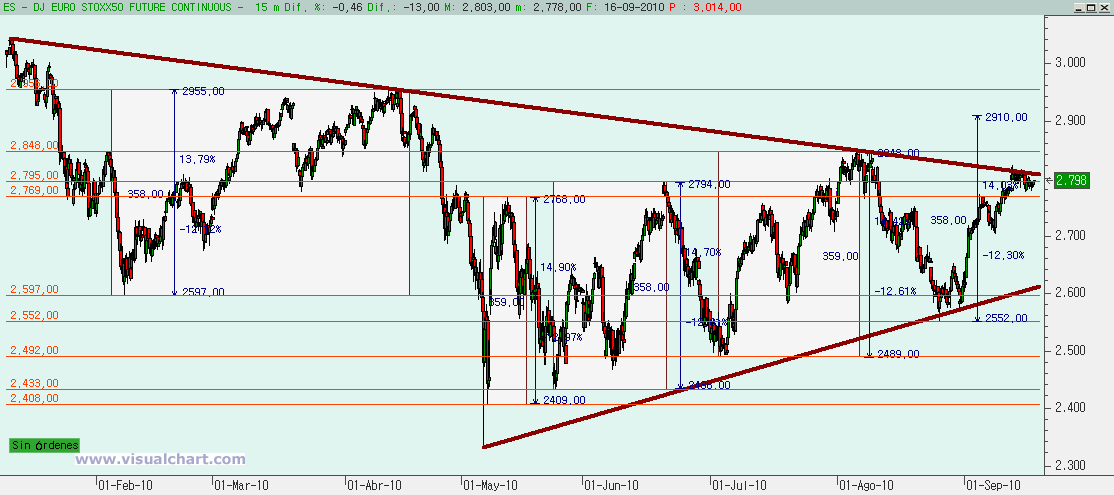 Y mañana suerte con los vencimientos y no nos dejemos engañar por los movimientos que nos hagan cuando sean los vencimientos sucesivos de Dax, Euro Stoxx, Ibex….. Y es que si vemos el gráfico de Euro Stoxx, vemos que sigue en la parte alta del triángulo señalado días atrás… Y ahí se ha quedado, hasta que mañana veamos si se rompe o si nos vamos a visitar la parte baja del triángulo.