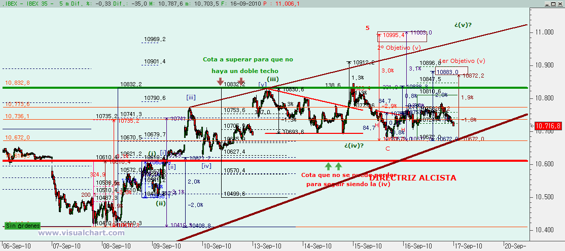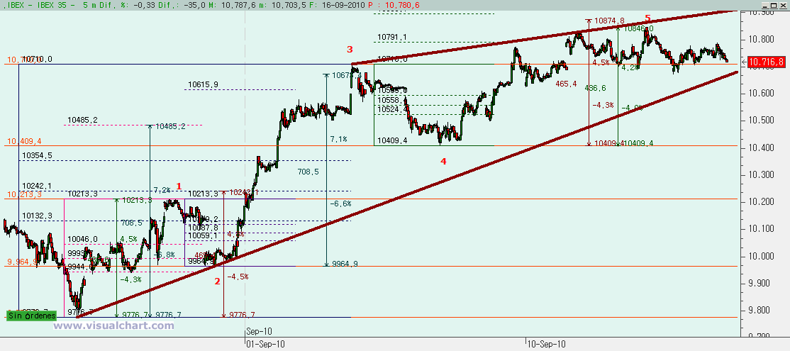 Psicoblog Jueves 16 de Septiembre de 2010: Llevamos ya unos cuantos días hablando del recuento de corto del Ibex. Desde los mínimos de finales de Agosto parece que estamos desarrollando el rebote en 5 ondas y desde hace unos días estamos ya en la que debería ser la 5. Y más concretamente, debemos estar ya terminando esa 5. Se trata de buscar una señal de giro cuando se alcance el objetivo alcista.