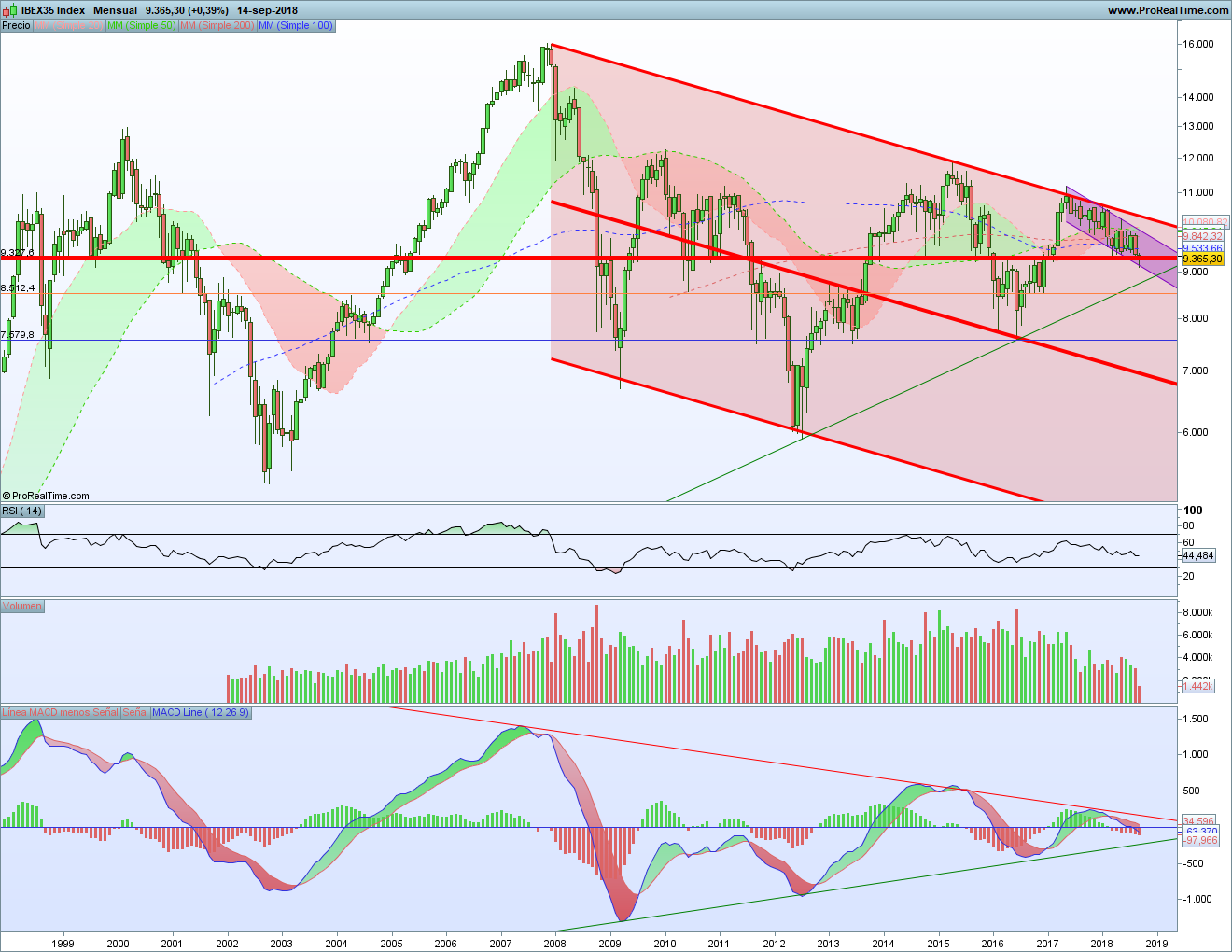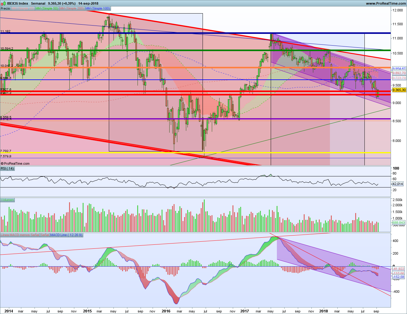 Pero también hay que darse cuenta de que se ha tocado la que era la parte baja del canal bajista morado desde el máximo de 2017. Evidentemente, desde entonces la tendencia es bajista. Pero, desde luego, no se puede romper un soporte tan importante caminando a través de un canal bajista tan estrecho. Si se rompe, debe de liquidarse el canal bajista y acelerarse la caída. Si no ocurre eso, lo normal es que estemos haciendo simplemente una corrección, una bandera.