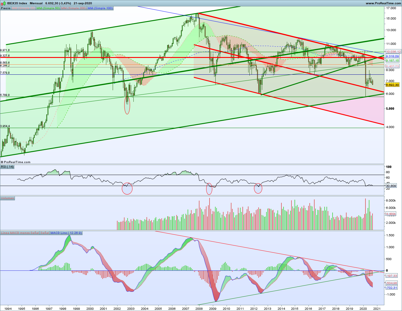 Esa será la referencia para el Ibex: la parte central del tridente. Y, como mucho, la parte baja del tridente alcista verde que viene desde 1993. Si el Ibex se para por ahí, podremos pensar en intentar hacer un suelo. Pero como no aguante, entonces va a ser inevitable pensar en la parte baja del tridente bajista rojo. Y eso sería una caída muy importante. Eso sí que sería un Ibex, sálvese quien pueda.