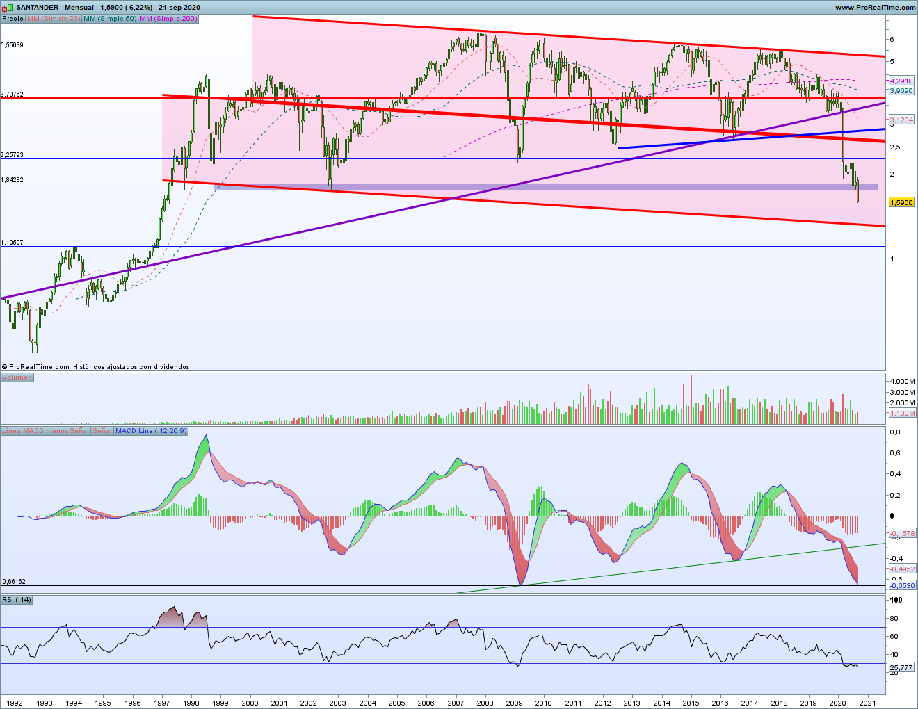El soporte en zona de 3,5 euros había sido el que paró la caída en marzo. Pero ahora se ha roto también. Y eso nos deja sin ningún soporte de relevancia hasta los mínimos de 2002 y con toda la pinta de acabar en la parte baja del tridente bajista que te he señalado. Y eso podría estar por la zona de los 2,2 euros. Que tampoco está tan lejos ya, un 26% por debajo, lo cual no es mucho viendo que desde febrero hemos caída más de un 50%.