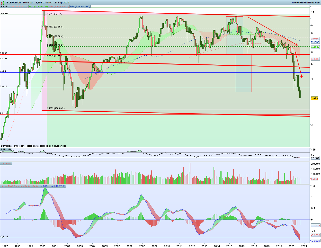 Ya te he dicho mucho sobre Telefónica y su tendencia claramente bajista desde 2015. En febrero rompió el soporte clave en la zona de los 5,8 euros y desde ahí, salvo el rebote hasta junio que solo fue un pull-back a la parte central del tridente bajista desde 2000, no hemos visto más que caídas.
