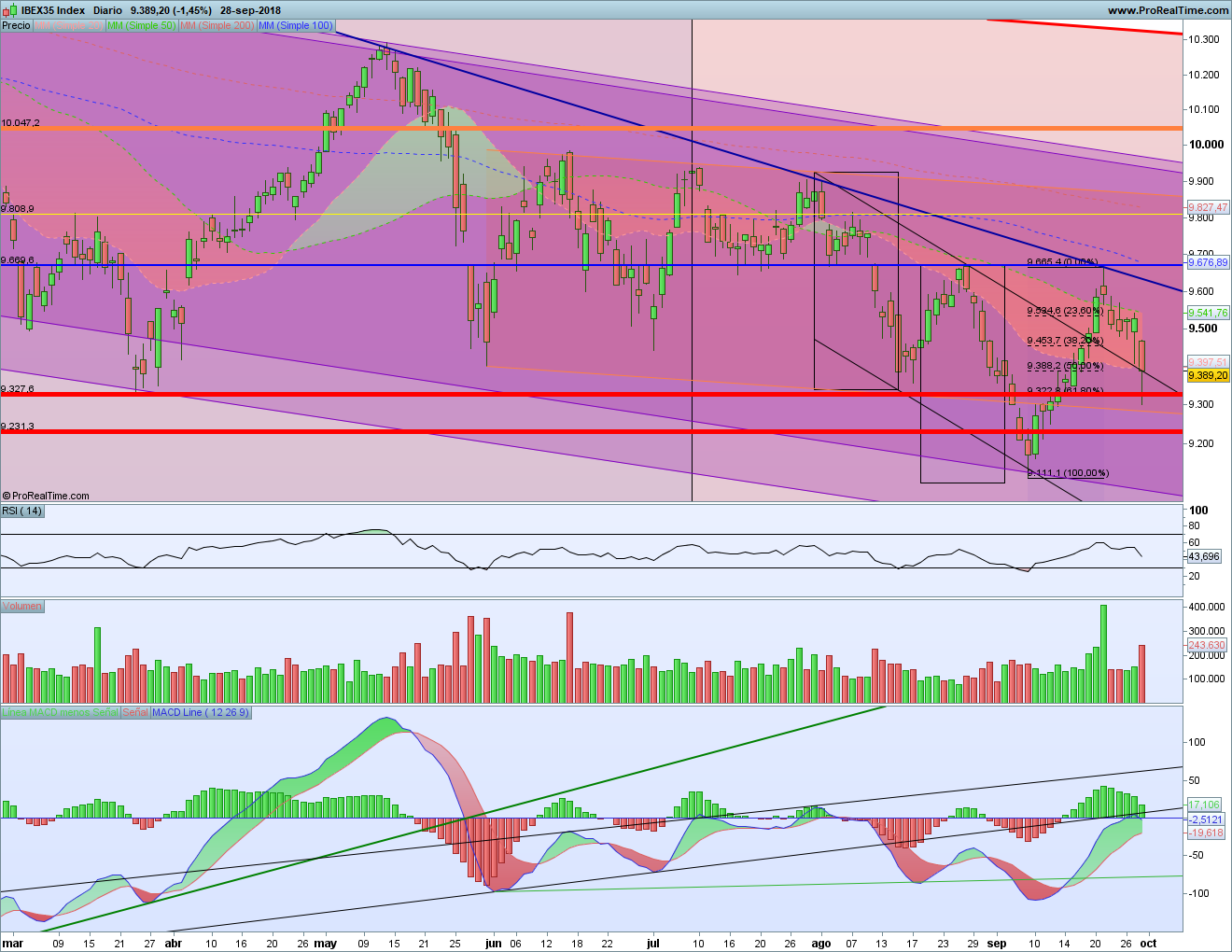 La semana pasada teníamos al Ibex atacando la resistencia horizontal azul y la MM20. Sin embargo ya hemos visto lo que ha sucedido ésta. Rechazo total en la resistencia, lo que nos ha vuelto a llevar a la zona de soporte en los 9.300c. Se trata, pues, de ver qué nivel se rompe antes. Si se rompe por abajo, cuidado. Mientras no se rompa la resistencia por arriba no podremos pensar en nuevas subidas.