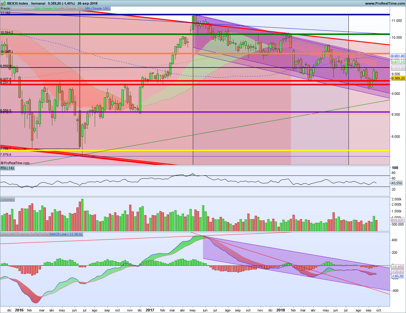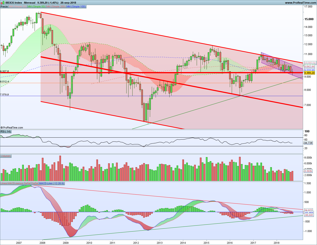 Pero cuidado si se rompe el soporte y si se quebrara el canal bajista por abajo acelerando la caída. Porque entonces seguiríamos la senda marcada por el tridente bajista que tenemos desde 2007 y habrá que pensar en ir a buscar la parte central del mismo. Aunque antes tenemos la alcista desde 2012 y el soporte horizontal por la zona de los 8.500c.