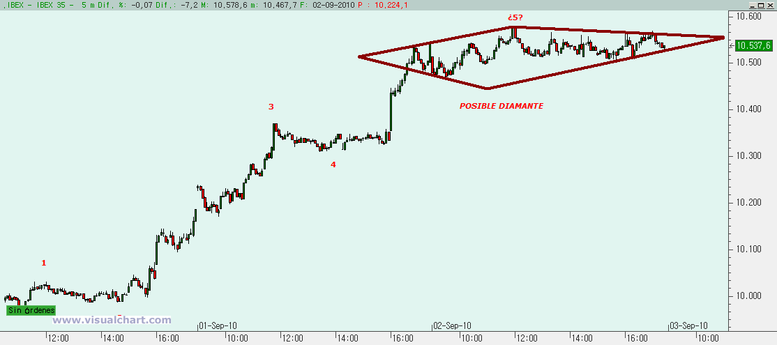 Sin embargo, en el gráfico de muy corto vemos una posible figura amenazante para estos largos: un diamante, con lo que ello conlleva. Decimos posible, porque aunque parece clara, mientras no se rompa y se cumpla, hay que tener mucha cautela. Pero si mañana se rompe por abajo, atención que sería la confirmación de finalización de este rebote. Si se rompe por arriba, la figura quedaría anulada. Por ello, mañana muy atentos a lo que pueda suceder.