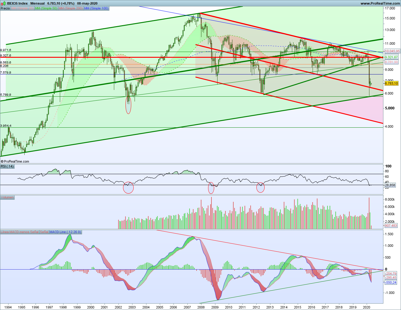 Por otra parte, la parte central del tridente bajista desde 2007 también está parando la caída. La vela de marzo cerró justo ahí, aunque se hiciera un mínimo por debajo, el mínimo de la vela de abril se quedó ahí y se cerró por encima y ahora en mayo estamos aún por encima.