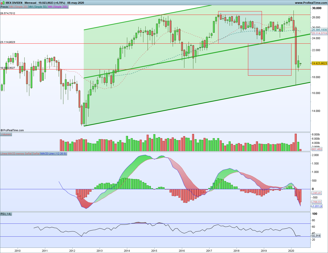 La clave ahora, por abajo, está en el soporte horizontal zona 19.000 – 19.100 y parte baja del tridente alcista. Mientras esto aguante, podremos pensar en que podríamos haber hecho un suelo. Si se pierden, cuidado… Pero insisto siempre, para darlas por perdida tenemos que ver dos cierres mensuales por debajo.