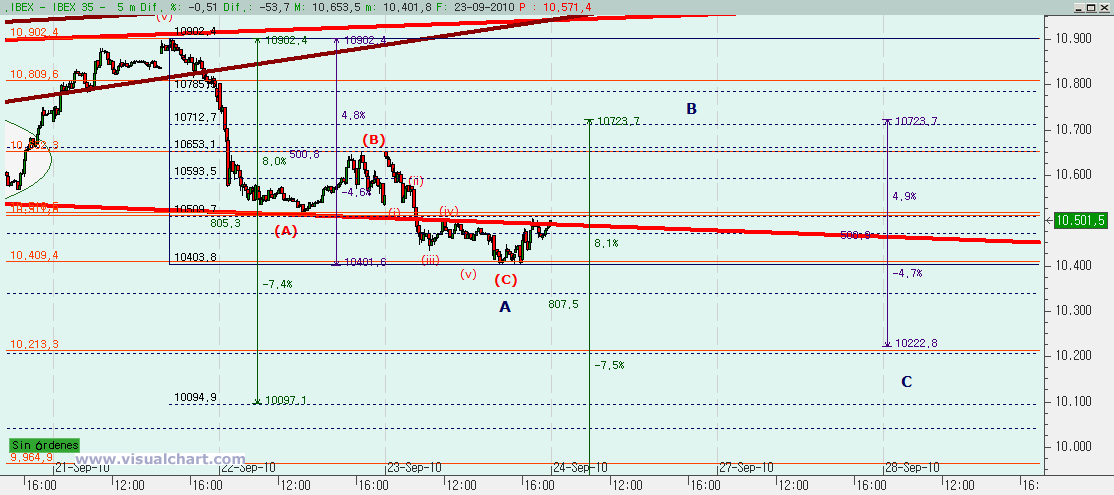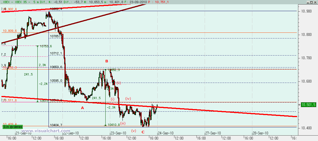 Además, si hacemos un zoom en el gráfico de 5 minutos para ver la caída desde los máximos del martes, nos damos cuenta de que podríamos tener ya formada una ABC que ha llegado al objetivo de la corrección y en la que la C coincide casi exactamente con el 61,8% de la A. Luego estos entornos de los 10.400 eran una zona muy propicia para probar unos largos con un stop ajustado.
