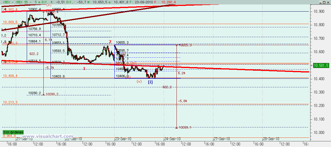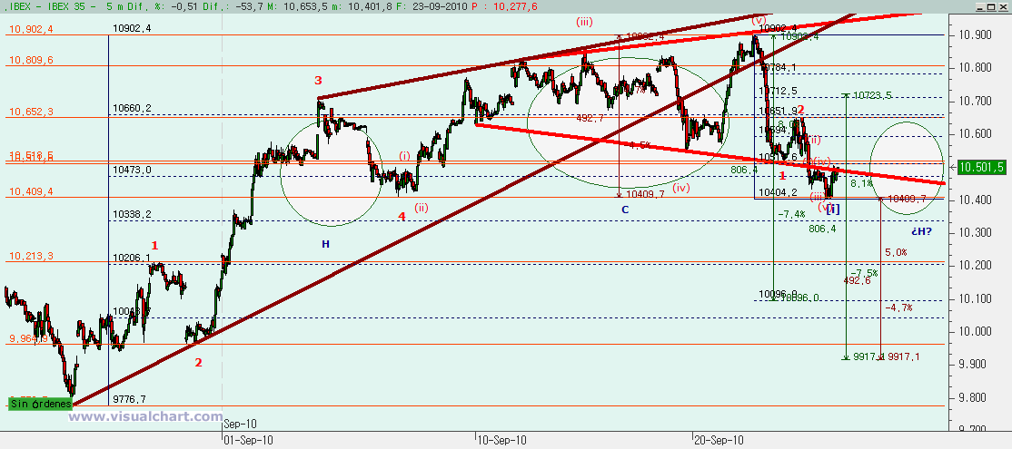 Psicoblog. Jueves 23 de Septiembre de 2010: Durante estos últimos días hemos venido alertando de que el rebote producido en el Ibex desde los mínimos de finales de Agosto parecía estar produciéndose en 5 ondas. A la vez, hemos venido anunciando que el objetivo para finalizar la quinta había terminado y que, una vez que se produjera una señal de giro en el gráfico diario, deberíamos ver una corrección que nos llevara a la zona de la onda 4 del impulso alcista previo.