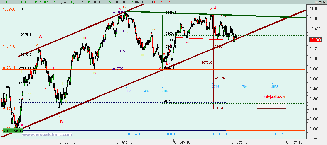 Escenario 2: En este caso, la caída se desarrollaría en 3 ondas bajistas nada más. Sería la B de la corrección alcista iniciada en los mínimos de Junio, con lo que tras terminar estas 3 ondas bajistas, deberíamos tener 5 alcistas. Si así fuera, ya habríamos formado las 2 primeras ondas, la A desde los máximos de principios de Agosto a los mínimos de finales de Agosto, la B desde esos mínimos a los máximos del 21 de Septiembre y ahora estaríamos formando la C. El primer objetivo bajista para esta C estaría entre los 9.792 (que harían llegar la C a los mínimos de la A) y los 9.722, que harían la C igual a la A, con los 9.768 (retroceso del 50% de la subida desde Junio a Agosto). Es decir, el primer rango objetivo estaría entre los 9.722 y los 9.792. El segundo objetivo estaría entre los 9.138 (retroceso del 78,6% de la subida desde Junio) y los 9.004 (que harían la C igual al 162% de la A), con los 9.115 (retroceso del 162% de la B) entre medias. Luego el segundo objetivo de la C estaría entre los 9.004 y los 9.138. Habría otra tercera opción, que nos hablaría de que la C sólo alcanzaría el 61,8% de la A, es decir, hasta los 10.165. Esta sería la opción más alcista de todas.