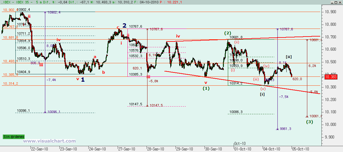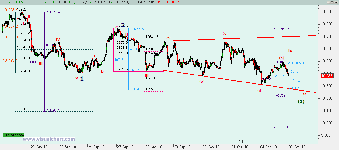 La existencia de lo que podría ser un triángulo expansivo nos hace pensar en que ese tramo sea una cuarta. Ya sabemos que las ondas cuatro suelen ser complejas y formarse en triángulo, por eso podría ser una cuarta. El problema es ver cómo encaja dentro de la 3. Tal vez este triángulo sea la v de la subonda (1) de la 3. Esto nos haría pensar que mañana debemos caer algo más, probablemente hasta el rango 10.257 – 10.277 (retroceso 162% de la iv y la cota que haría la v igual al 61,8% del conjunto i-iii). Si así fuera, entonces ahí deberíamos ver un rebote para formar la (2) que no podría pasar nunca de los 10.767, máximos de la 2 y comienzo de la (1) de la 3.