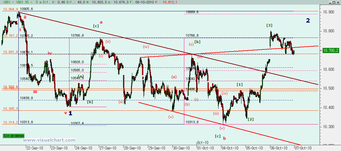 Psicoblog. Miércoles 6 de Octubre de 2010: Tras analizar en el artículo previo (ver artículo) la situación a muy corto del Ibex desde el rebote comenzado en los mínimos del Lunes, ahora vamos a intentar enlazar esta situación con la de más atrás, de modo que podamos intentar descifrar hacia dónde vamos.