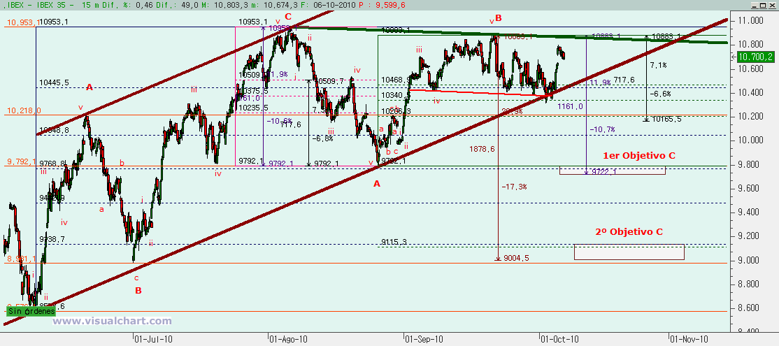 Si volvemos a nuestro gráfico desde los mínimos de Junio, seguimos pensando que tras una ABC alcista debemos tener, como mínimo, otra ABC bajista, con lo que quedaría la C. Y ya hemos dicho que la C, como mínimo debería ser igual que la A,es decir, que debería llevarnos a los entornos de los 9.700, 1.000 puntos por debajo de donde estamos ahora.