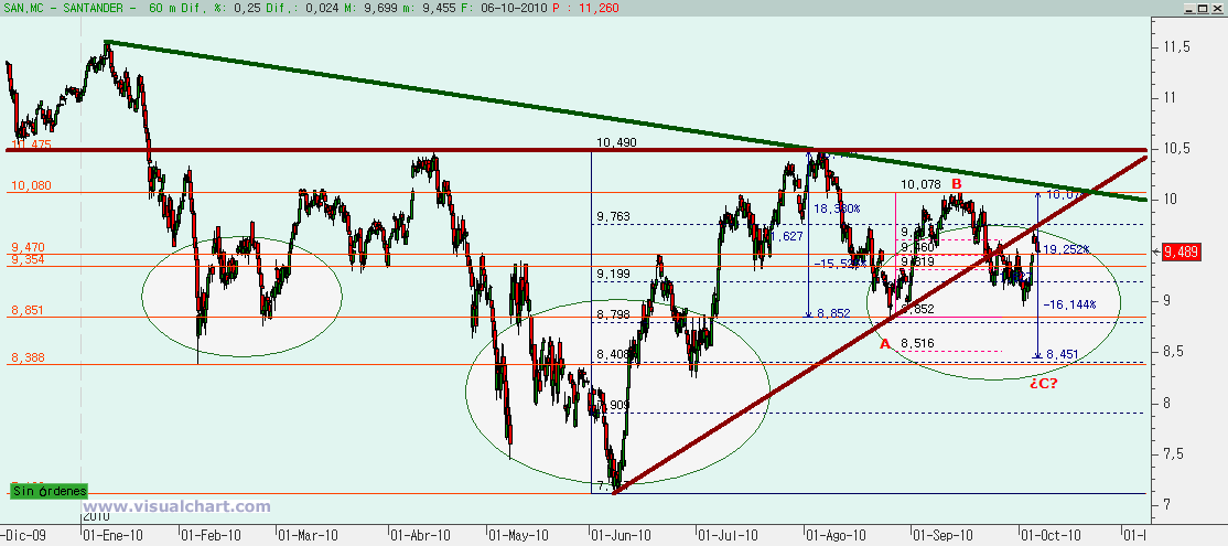 PD: Karlos, te pongo un gráfico del Santander, por si acaso… Tras romper la alcista desde Junio, hoy ha regresado a ella en lo que podría ser un pull-back… Veremos si es así y si podría irse a la zona de los 8,40 si tuviéramos el giro que pensamos en el Ibex…