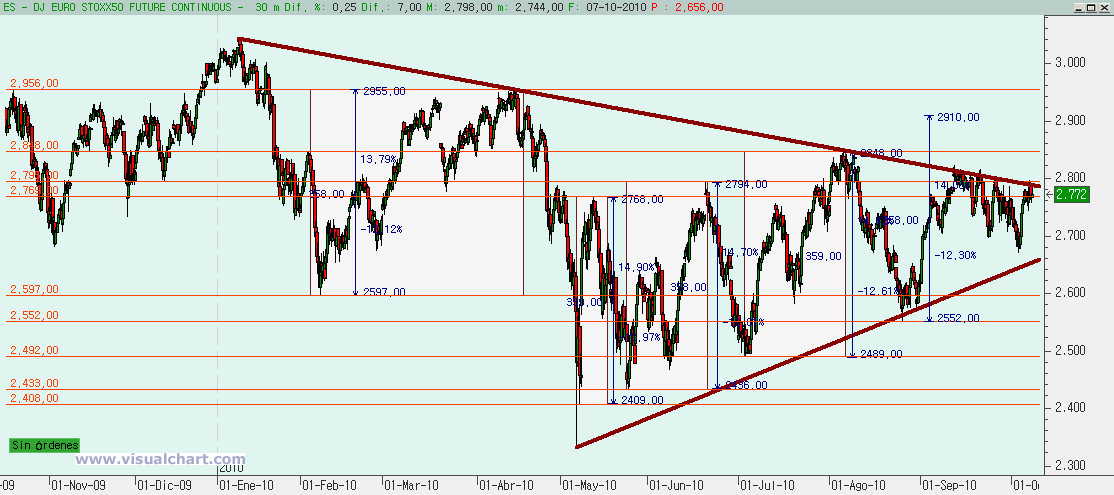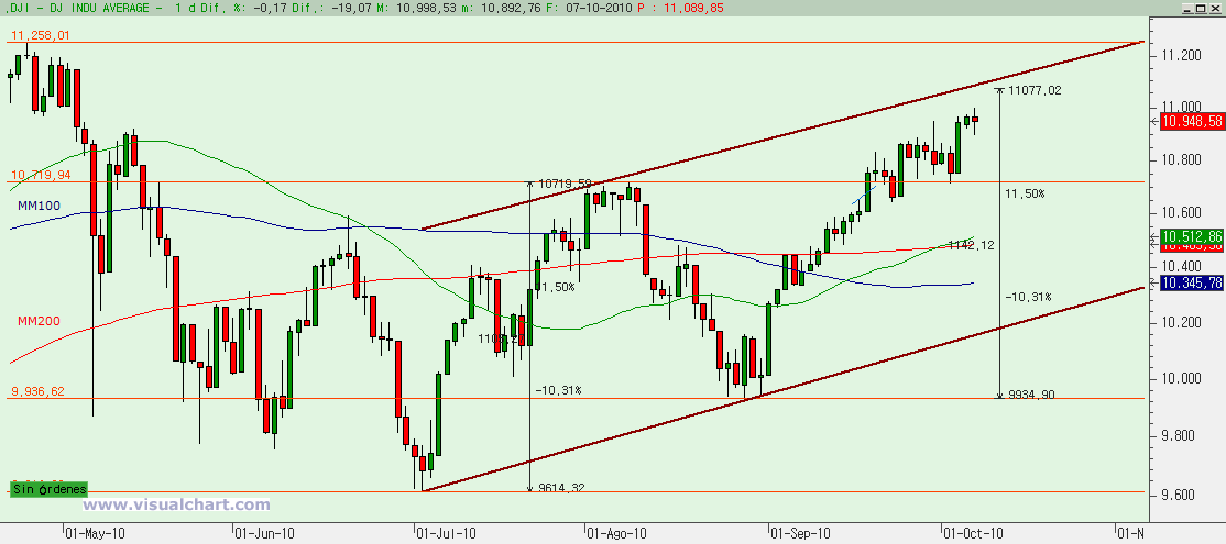 Por último, y como sé que a Karlos le gustan las simetrías, si te fijas en el gráfico del Dow Jones, para que haya una simetría, con la subida entre mínimos de Julio y máximos de Agosto, se debería llegar a los 11.077… Y el canal alcista es muy claro…
