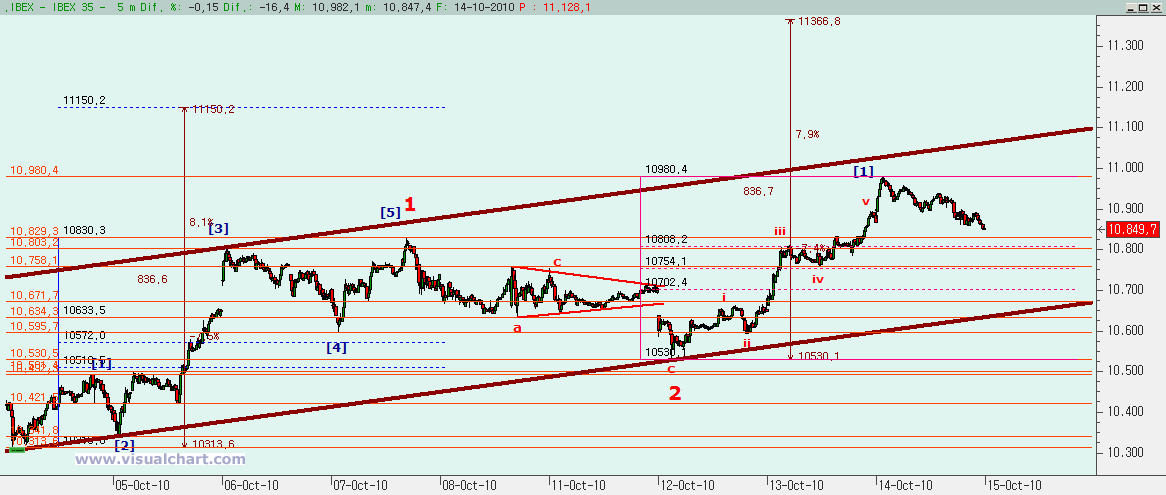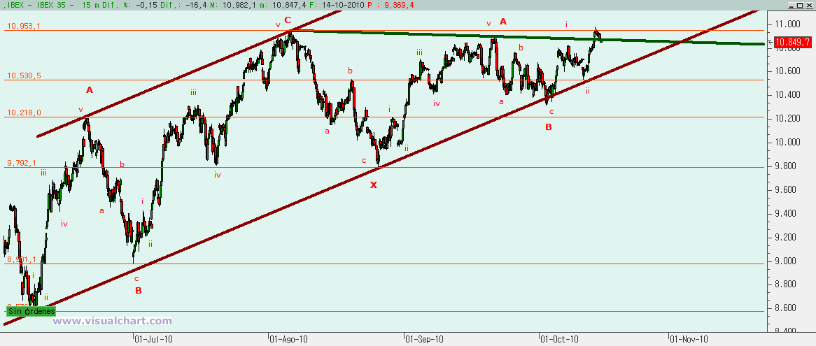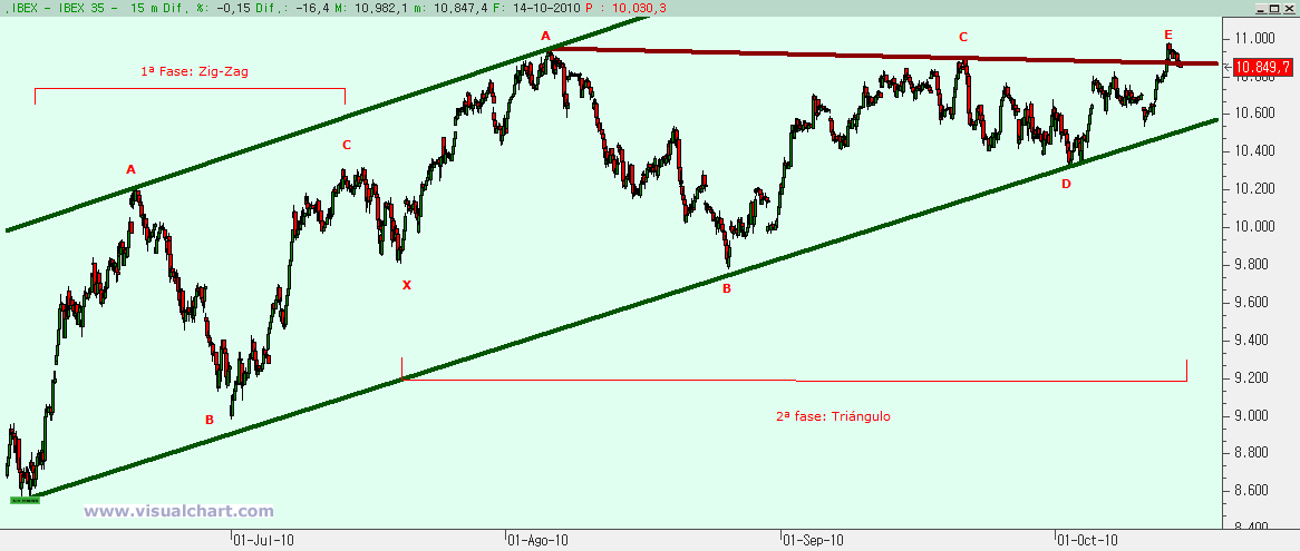 Psicoblog. Jueves 14 de Octubre de 2010: Ayer señalamos dos posibilidades en el medio plazo. La primera era la existencia de una doble combinación desde los mínimos de Junio: primero una zig-zag, luego una pequeña corrección y, por fin, un triángulo, donde debíamos estar haciendo la E y que debía terminar en la parte alta de ese triángulo o ligeramente por encima o por debajo. La segunda opción era un doble zig-zag que nos proyectaba bastante más arriba. También señalamos el recuento de muy corto con el rebote de ayer y los objetivos alcistas para ese rebote. El primer objetivo lo rompimos a primera hora de la mañana. Pero en el segundo hemos parado en seco y desde allí hemos podido abrir unos cortos que han dado su rendimiento.