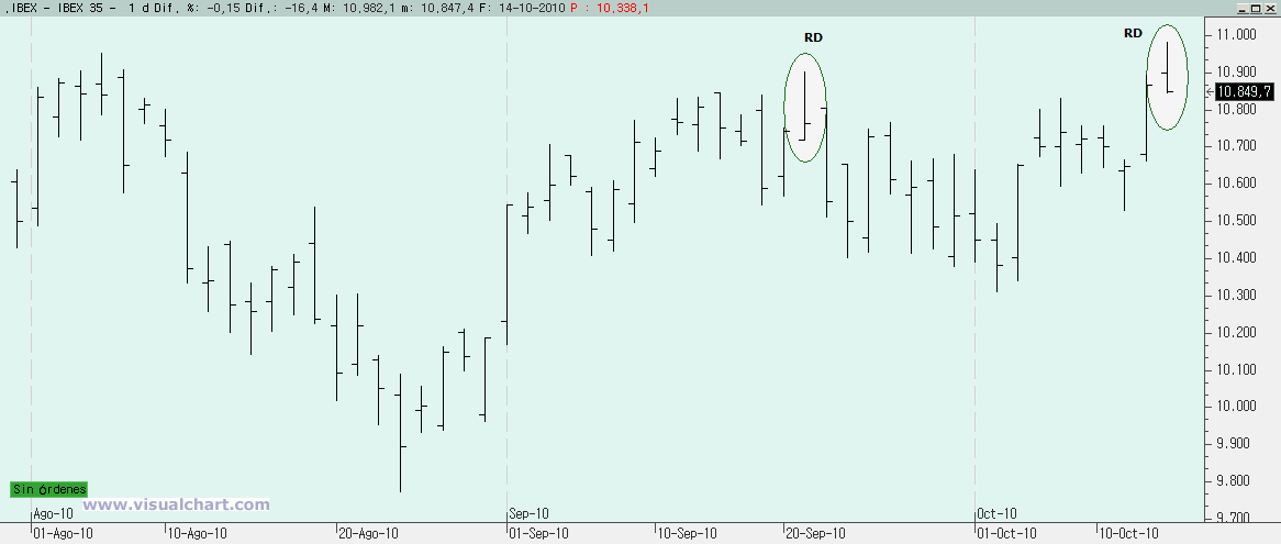 Pero ya hemos dicho que en los máximos de hoy teníamos el objetivo para que terminara la [5], con lo que sólo teníamos que esperar una señal de giro para ver una corrección, al menos, o una caída. Y esta señal la hemos visto al cierre, con un Reversal Day en el gráfico diario. Una señal que consiste en abrir por encima del cierre de ayer, ver nuevos máximos y cerrar por debajo del cierre de ayer. Como podemos ver en el gráfico, la señal de giro se ha producido y en la proyección justa para finalizar la [5]. Y ya vimos en la anterior señal del mismo estilo (RD) la caída que tuvimos después, concretamente 400 puntos desde el cierre de la RD hasta los mínimos posteriores. Ahora podríamos ver algo así. Recordemos, para los que se hayan puesto cortos aprovechando esta señal, que el stop debe ponerse en los máximos de hoy más un ligerísimo filtro de unos pocos puntos.