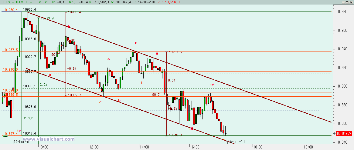 Pero si hacemos un zoom en la caída desde los máximos de hoy para ver si tiene aspecto de correctiva o de impulsiva, podemos ver que la caída se ha producido en un canal bajista perfecto. Pero el recuento podría indicarnos una corrección más que el inicio de un tramo bajista. Y es que podemos haber visto una ABC inicial hacia abajo (sería una A), luego una ABC para arriba (sería una B)y luego 5 para abajo (la C), de tal modo que la A habría sido exactamente igual a la C. Parece encajar. Pero como no hemos llegado siquiera al 38,2% de las 5 ondas previas, esto podría sólo ser la primera parte de la caída (realmente la A). Mañana deberíamos ver la B hacia arriba, de tal modo que llegáramos a los entornos de los 10.900 y luego volver a caer para llegar a los entornos de los 10.750 – 10.800 o incluso algo más. Pero ojo, que hoy ya hemos hecho una posible ABC, de modo que la correcció podría hasta estar completa.