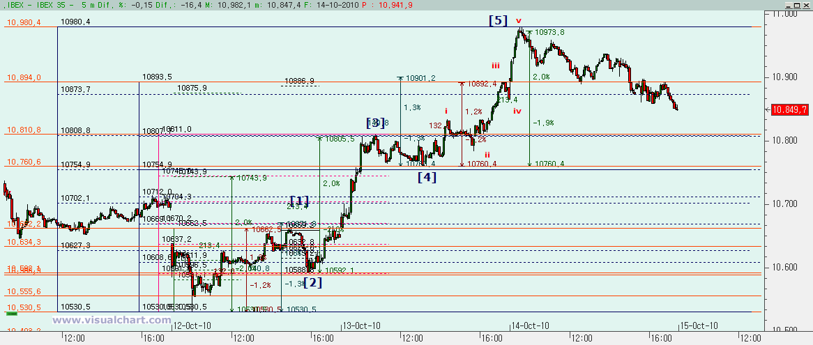 Si miramos el gráfico de muy corto en lo que habría sido la [i] de la iii en este último escenario o la c de la E del primer escenario, vemos que hoy se rompió a primera hora el primer rango objetivo para la [5], pero en el segundo (donde coincidían la cota que hacía la [5] igual al 162% de la [1] e igual al 78,6% del conjunto [1]-[3]) se frenó la subida y comenzó una corrección (la cota estaba en los 10.973 y llegamos a los 10.980).