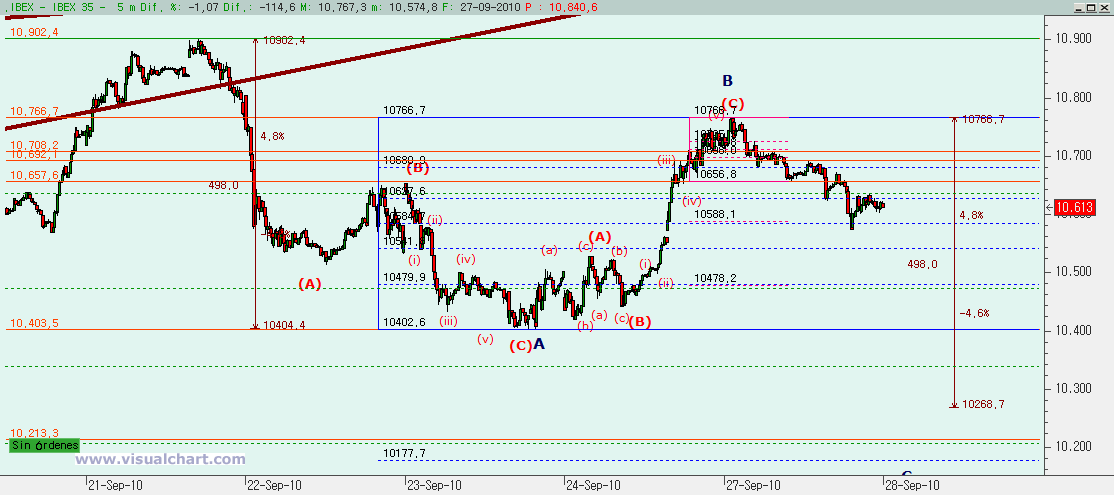 Psicoblog. Lunes 27 de Septiembre de 2010: Tras el cierre del viernes señalamos dos posibilidades para el Ibex a corto. La primera nos decía que la caída desde los máximos del día 21 no había sido toda la corrección, sino que sólo había sido la primera parte, la A. El rebote que vino a continuación, con la poderosa subida del viernes no era otra cosa que la B y que ahora debíamos volver a bajar. La otra opción, sin embargo, nos decía que la caída desde máximos del día 21 sí que había sido toda la corrección, al acabar en la zona de la onda 4 del impulso alcista previo. El rebote que vino desde entonces no era otra cosa que el comienzo de un impulso alcista.