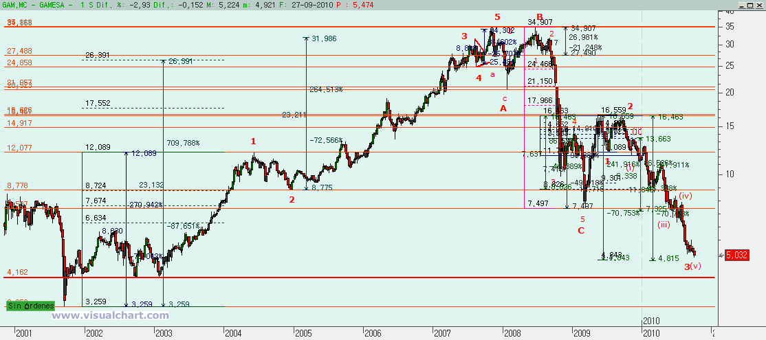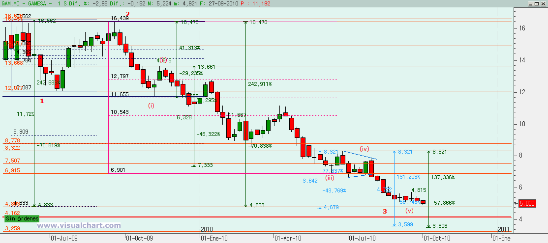 PD: Karlos, te pongo el gráfico de Gamesa, con un posible recuento. Como verás, el soportazo que tú decías sale en el 4,162… Por otra parte, en el 4,815 puede salir un final para una onda 3 bajista… Se podría intentar largos para conseguir el rebote de una 4, pero tampoco es un nivel tan claro, las 3 pueden irse un poco más…
