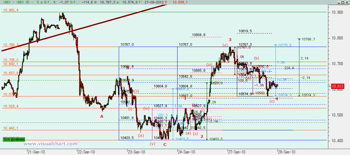 Escenario 2: La corrección acabó el jueves en la zona de la 4 del impulso alcista previo (desde mínimos de Agosto). Entonces lo que tenemos es un nuevo impulso alcista que debe formarse en 5 ondas. Si el viernes dijimos que habría terminado (o estaba terminando) la 3, esta caída es una 4. Viendo la forma de la caída de hoy, bien podría ser una ABC que ya habría terminado. El rango podríamos haberlo tenido entre los 10.567 y 10.585 (donde estaban el 61,8% de la 3 y el 50% del conjunto 1-3). Y en medio los 10.582, que hacían la posible (c) igual a la (a), tal y como hemos marcado. Por eso hemos cerrado la mitad de la posición corta en los 10.580. La cota que anula este escenario es la pérdida de los 10.528, máximos de lo que sería la 1. Y si este escenario es correcto, realmente la corrección debería estar ya terminada, porque si la (c) fuera igual al 162% de la (a), entonces la proyección estaría en los 10.514, que ya está por debajo de esos 10.528… El stop profit que hemos marcado durante la sesión lo hemos puesto ligeramente por encima de los mínimos de la marcada como (a), por si en lugar de una (a) fuera la (1) de la C del escenario anterior, la (b) la (2) y ahora estuviéramos en la (3), y ya sabemos que la (4) no podría solaparse con la (1). Si el escenario es bueno y hoy hubiéramos terminado la 4 en los mínimos de la sesión, el objetivo para la 5 estaría entre los 10.775 que harían la 5 igual al 162% de la 1 y los 10.819, retroceso del 127% de la 4, con las cotas en medio de los 10.798 que harían la 5 igual al 61,8% del conjunto 1-3 y los 10.804, retroceso del 424% de la 2. Evidentemente, si la 4 no hubiera terminado hoy, entonces deberemos ajustar estas cotas con los mínimos que haga mañana y que, como ya hemos dicho, no podrían estar por debajo de los 10.528. Pero si se alcanzara el objetivo señalado, casualmente nos iríamos a la parte alta del triángulo de nuevo….