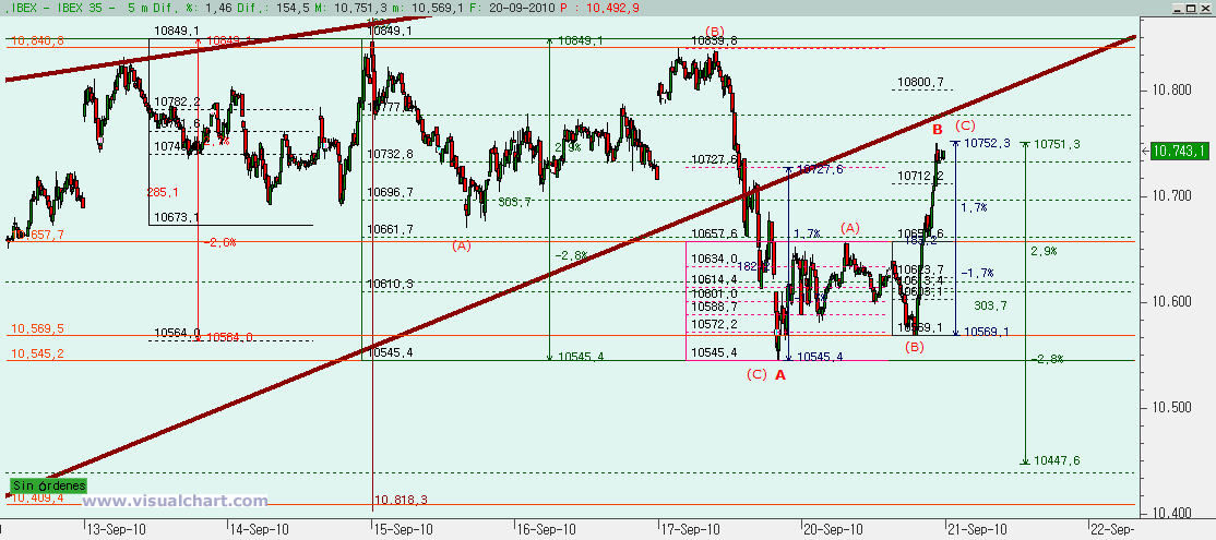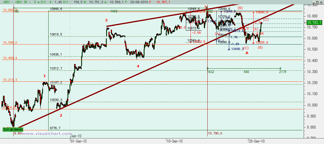 Psicoblog. Lunes 20 de Septiembre de 2010. Antes de los vencimientos del viernes anunciamos una caída ante la llegada al nivel previsto para la onda 5 y por la señal de giro que señalamos en el gráfico diario del Ibex (ver artículo). Ayer comentábamos que lo normal sería un rebote hasta los 10.700 en el día de hoy, pero ya hemos visto que el rebote ha sido mayor. Ahora se trata de intentar ver qué puede pasar en las próximas sesiones.