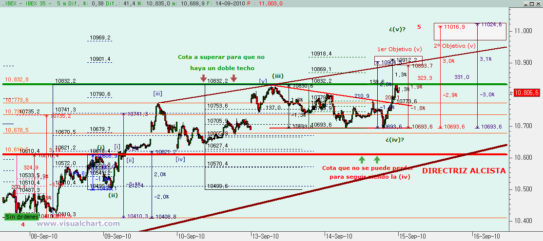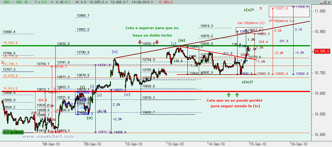 En primer lugar, sabemos que las quintas son muy traicioneras, y que siempre cabe la posibilidad de que haya un fallo de quinta. Y qué mejor forma de terminar una (v) que con un doble techo que no alcanzara el objetivo marcado y que acabara en el mismo nivel que la (iii). Esa era la cota de los 10.832. Y es donde hemos llegado a poco del cierre y donde nos hemos parado. ¿Qué hacer para saber si hemos acabado? Pues muy fácil, esperar a ver si rompemos. Por arriba esos 10.832. Por abajo la parte baja del triángulo de hoy en los 10.690 y, sobre todo, esos 10.610, no sea que aún estemos en la (iv).