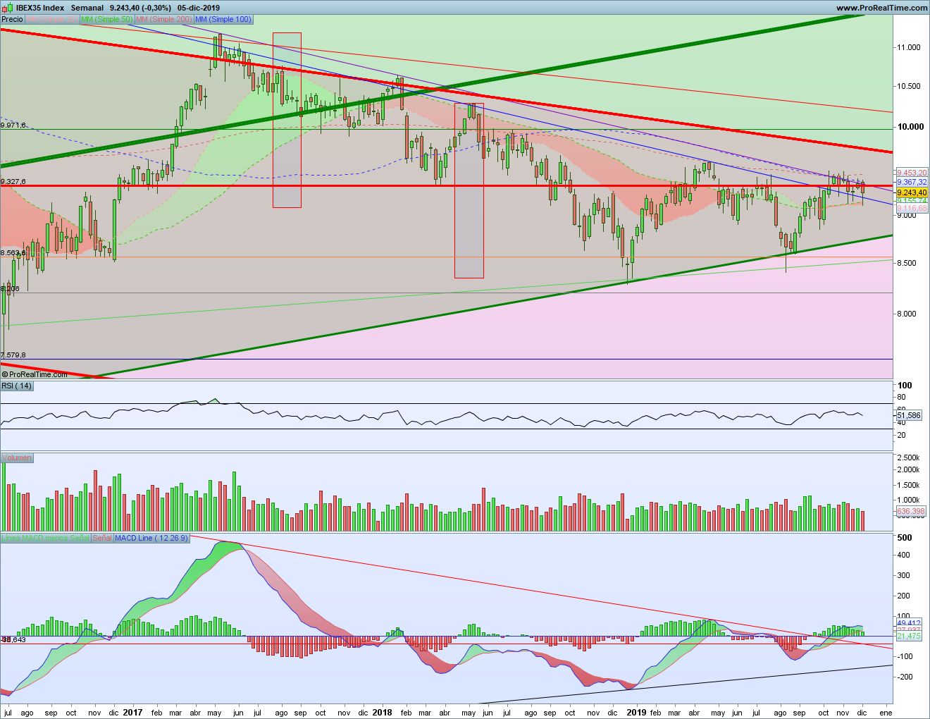 Y así seguimos. De momento, lo primero es ver si se puede con la resistencia roja o no. Y, en base a ello, veremos después si se ataca la parta alta del tridente bajista desde 2009 o la parte baja del tridente alcista desde 2012. Algún día deberemos verlo, porque esos límites de los tridentes se acercan peligrosamente. El que el MACD se haya cortado al alza invita a pensar en ir hacia arriba, pero este corte es aún demasiado débil como para asegurar nada.