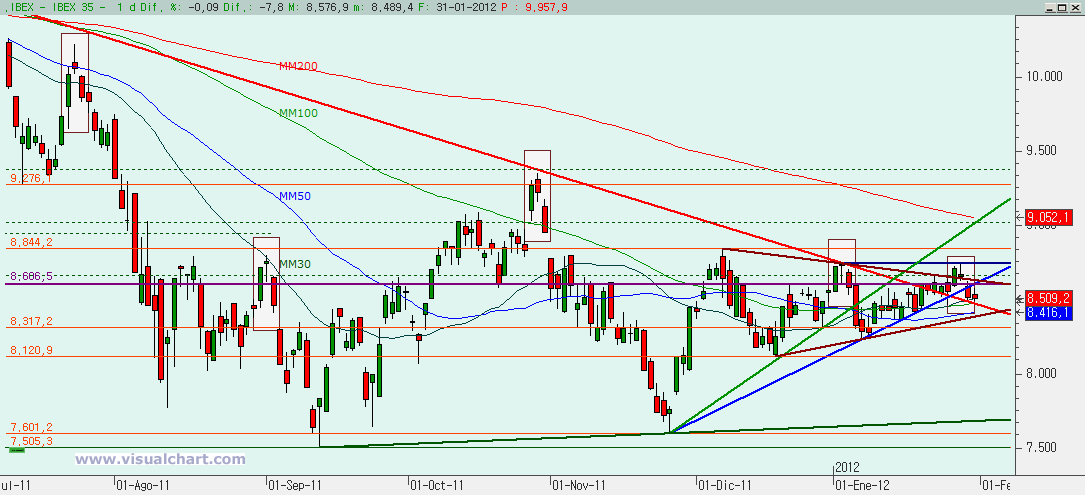Martes 31 de Enero de 2012: Jornada ligeramente bajista en el Ibex durante el día de hoy pero sin demasiada fuerza. Anoche teníamos la duda de si estábamos haciendo 5 bajistas desde el máximo del viernes o si habría sido una ABC y señalamos el máximo objetivo para un rebote si queríamos que fuera una 4: entre el 8.567 y el 8.589. Si rebotábamos hasta esa zona y luego hacíamos un nuevo mínimo es que eran 5 bajistas. Y parece que es lo que hemos hecho. Si así fuera, estas 5 bajistas serían solo el comienzo de una caída mayor, pero vamos a ver los gráficos para ver las opciones.