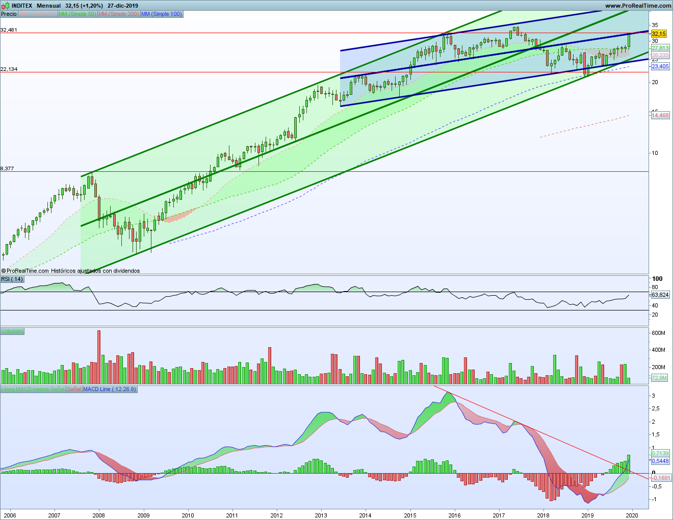 Inditex: ¿rumbo a máximos? Uno de los valores del Ibex de 2019 ha sido Inditex. Y, en gran parte, es el responsable de que el Ibex, aunque rezagado con respecto al resto de índices europeos y mundiales, haya podido subir dos dígitos en el año.
