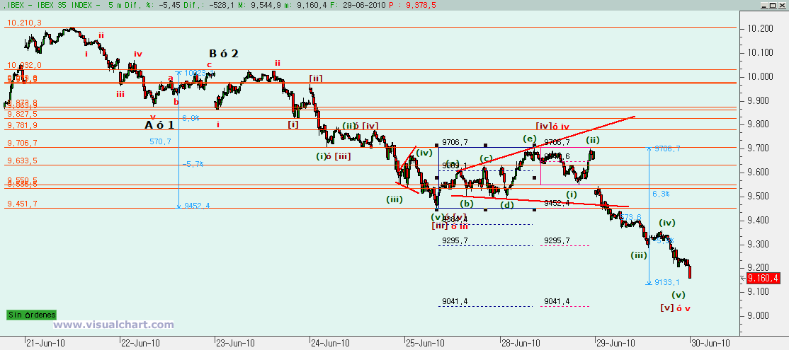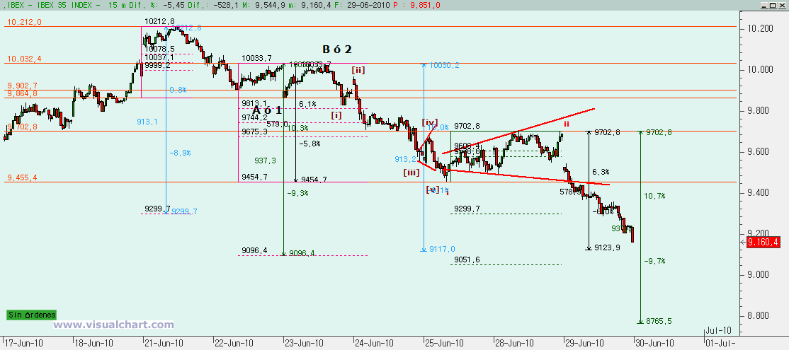 Sin embargo, tras revisar y revisar el gráfico, podría haber otra posibilidad, otro posible recuento que nos hiciera pensar en cotas inferiores. ¿Y si la caída hasta el 25 de junio hubiera sido solo la i, el triángulo expansivo de después la ii y la caída de hoy la iii (o parte de ella)? Si así fuera, tendríamos una primera proyección de caída en los entornos de los 9.123 (ojo con estas cifras que pueden variar en unos puntillos según uses el Visual Chart, aunque muy pocos) si la iii fuera igual a la i. Además, los 9.117 harían que esta onda fuera igual al 262% de la que hemos marcado como A ó 1. En los 9.096 estaría el retroceso del 162% de la i. Y más abajo, en los 9.051 estaría el retroceso del 262% de la ii. Por ello, en esta zona entre los 9.051 – 9.123 tendríamos una primera zona de posible rebote. Sin embargo, si se pierde, el siguiente objetivo lo tendríamos en los entornos de los 8.765 para hacer la iii igual al 162% de la i.