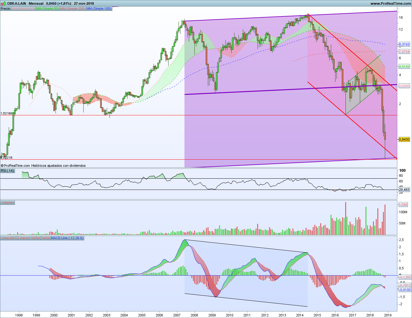El gráfico de OHL presenta muchas similitudes. Tenemos una caída importante que comienza en los máximos de 2014 y que se va acelerando hasta llegar al mínimo de 2016. Ahí justo se alcanza el soporte marcado por los mínimos de 2000 y 2003 y se rebota.